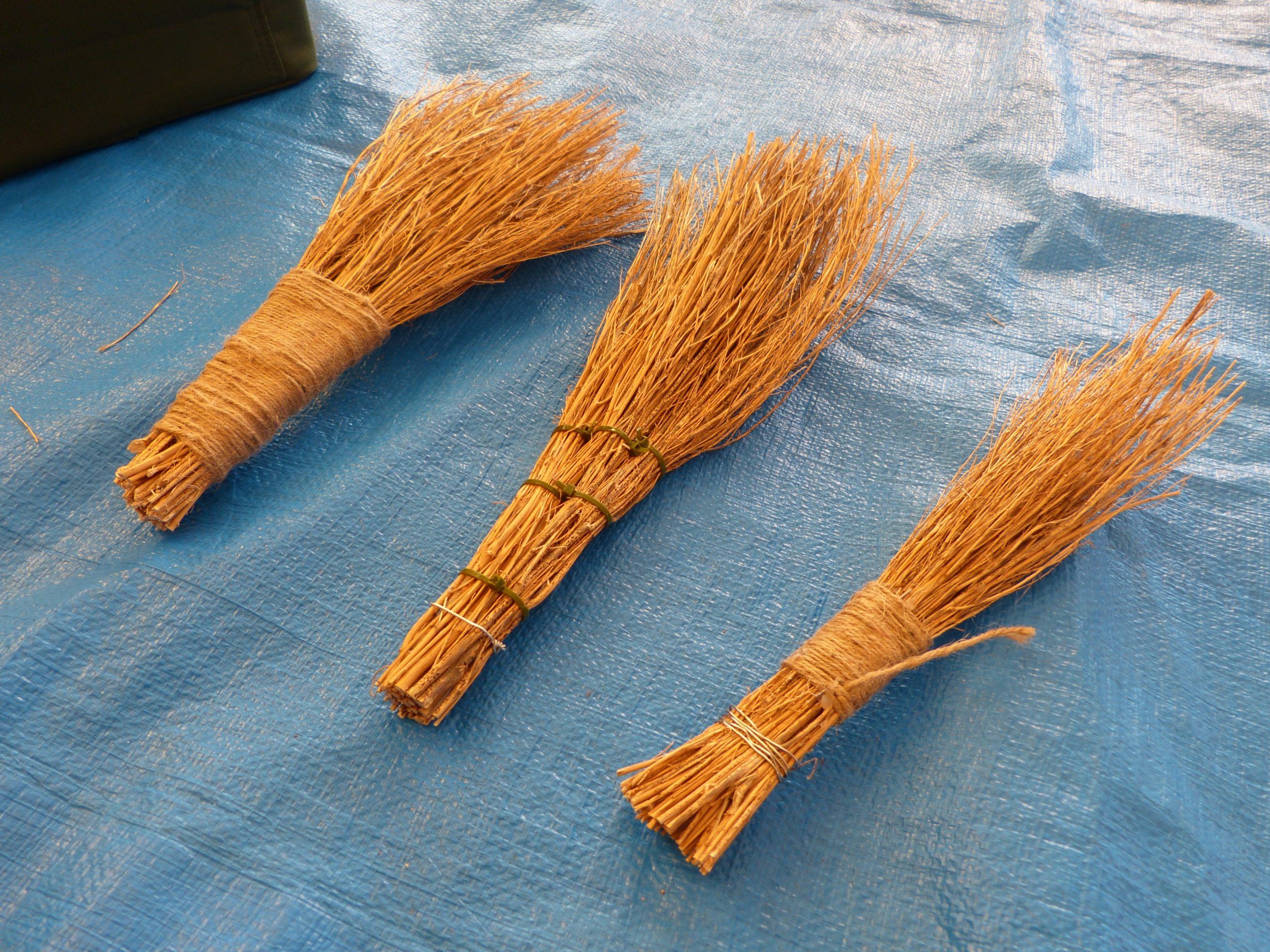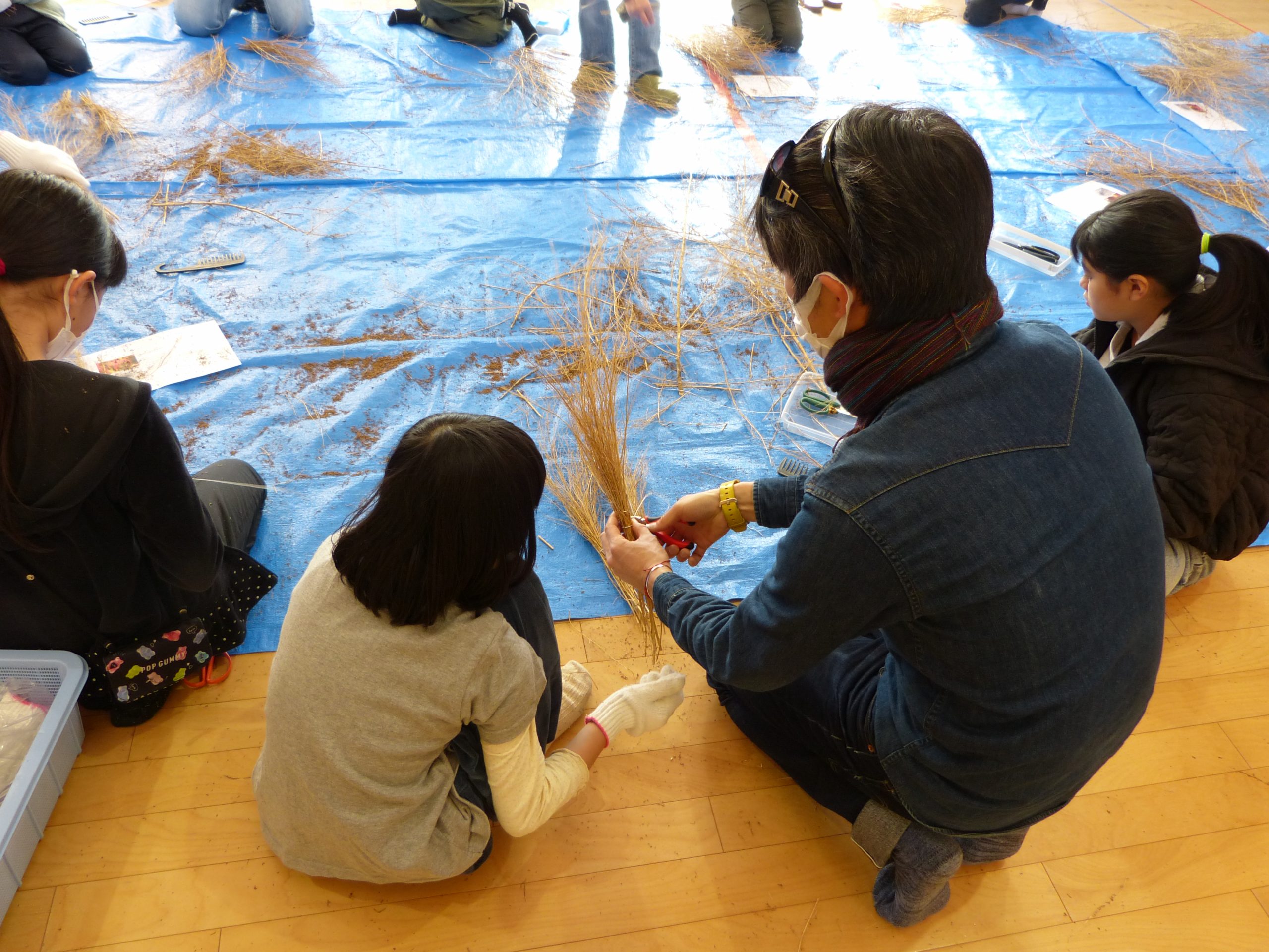 参加した児童らは、枝についている種や葉を丁寧に取り除き、複数の枝を束ねて麻紐などで固定し、穂先を整える作業を一つひとつ丁寧に進めました。